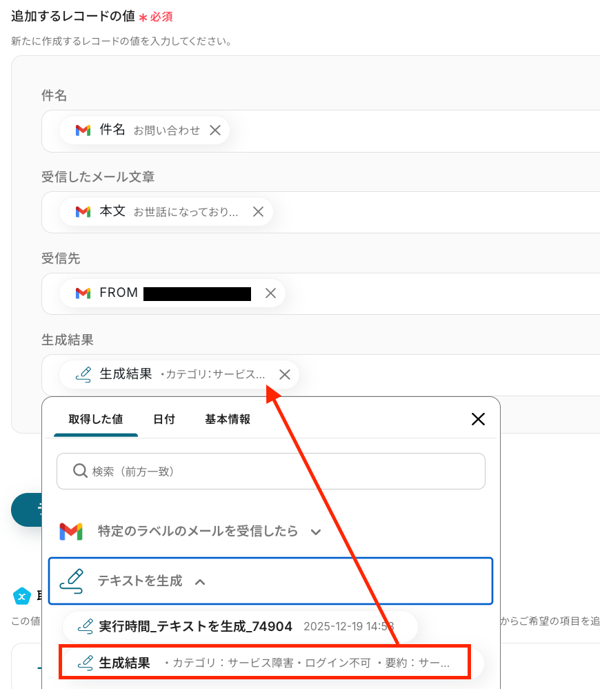 ステップ6:Google スプレッドシートにレコードを追加する設定 ステップ5で設定した分岐条件に基づき、返信が必要だと判断された場合に、受信したメールの文章やテキスト生成の結果を指定したシートに追加する設定を行います。 それでは、以下の赤枠をクリックしましょう!