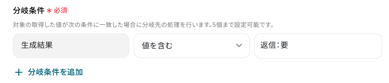 次の画面で、分岐条件を指定していきます!「オペレーション」 は、「テキストを生成」を選択してください。「取得した値」 は、先ほどのステップで取得した「生成結果」を設定しましょう!
