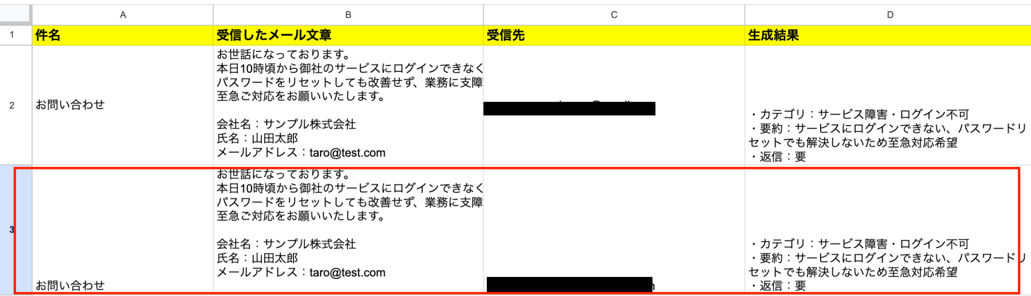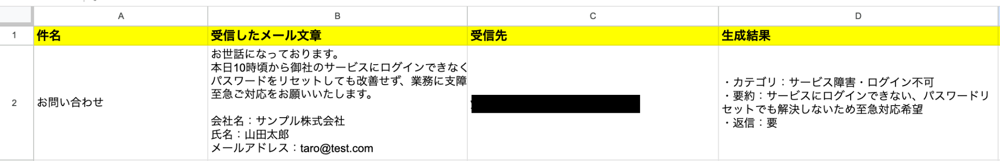 Google スプレッドシートの画面に移り、レコードが追加されているか確認をしてみましょう。 確認されましたね。 ※今回はテスト操作のため、ステップ6で追加した値と同じ値が追加されています。 以上で「Gmailの受信メールをAIで整理しGoogle スプレッドシート管理と自動返信を行う」 フローの完成です。