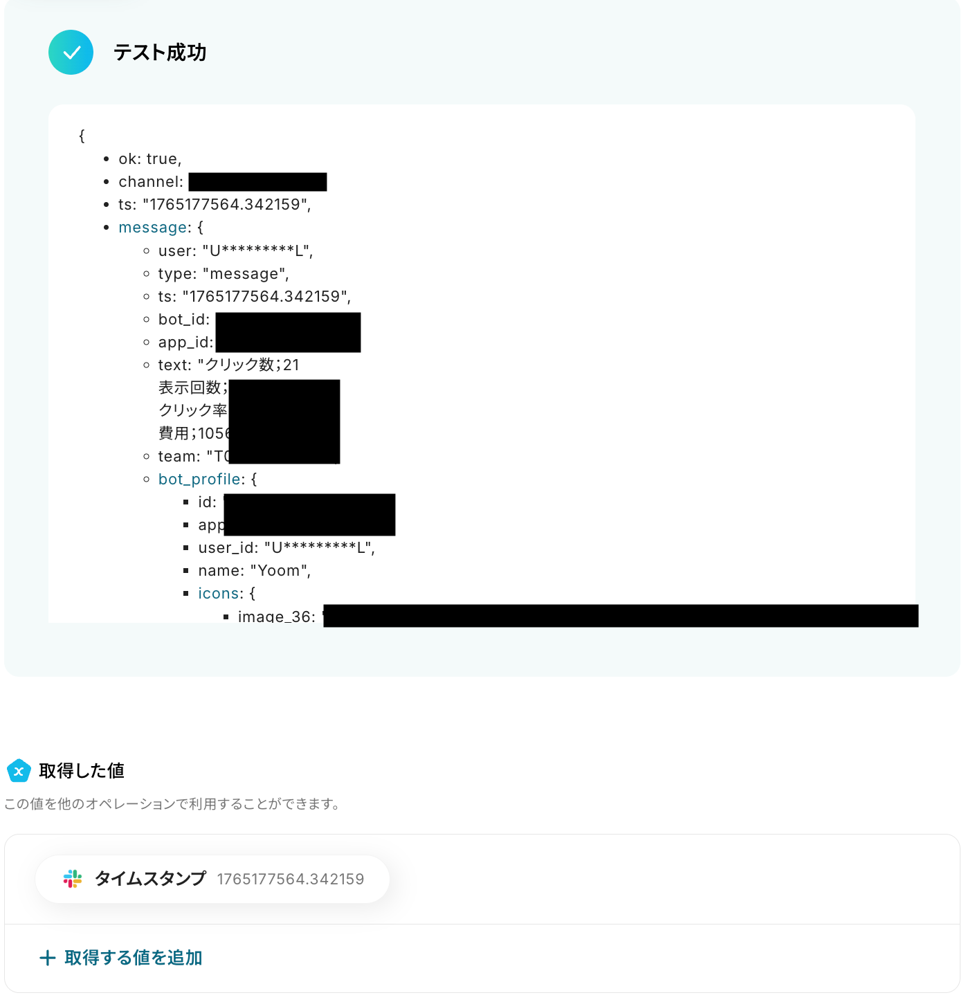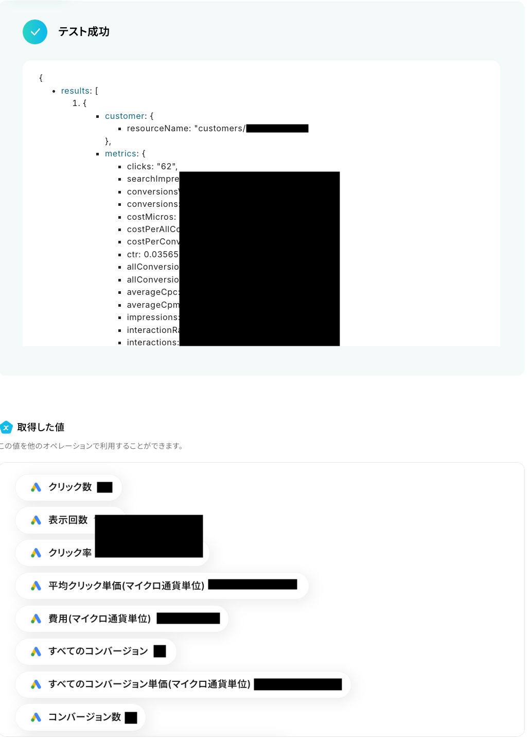 テストに成功すると、Google Adsから取得されたアカウントレポート情報が表示されます。 以下の画像の取得した値はこの後のステップで利用できます。