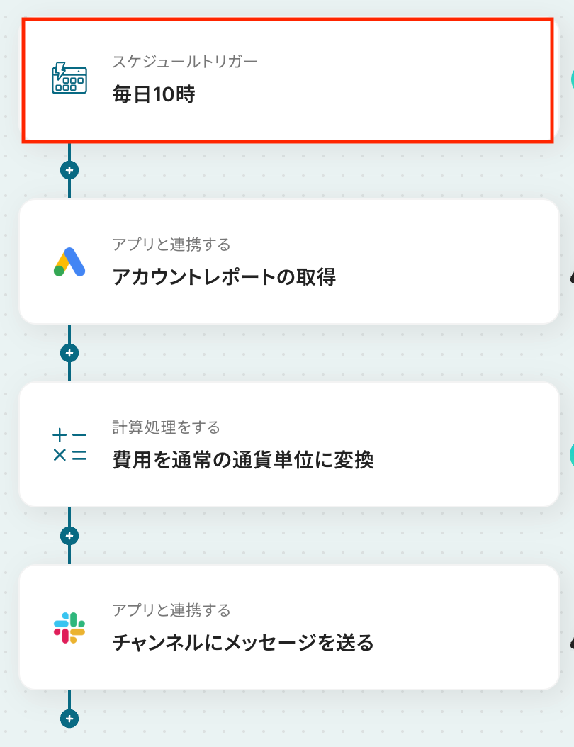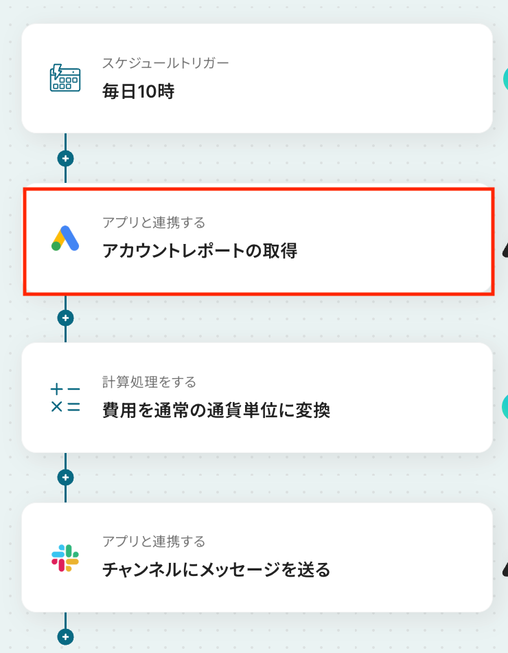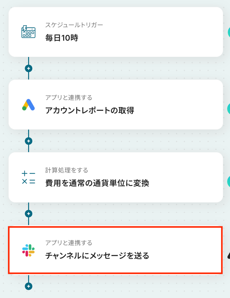 毎日Google Adsからレポートを取得してSlackに通知するフローを作ってみよう それではここから代表的な例として、毎日Google広告からレポートを取得し、Slackに自動で通知するフローを解説していきます!