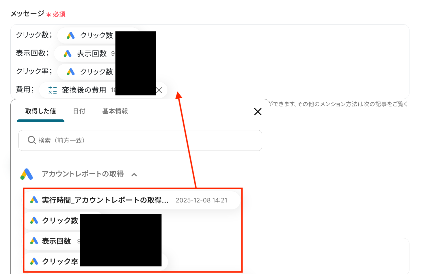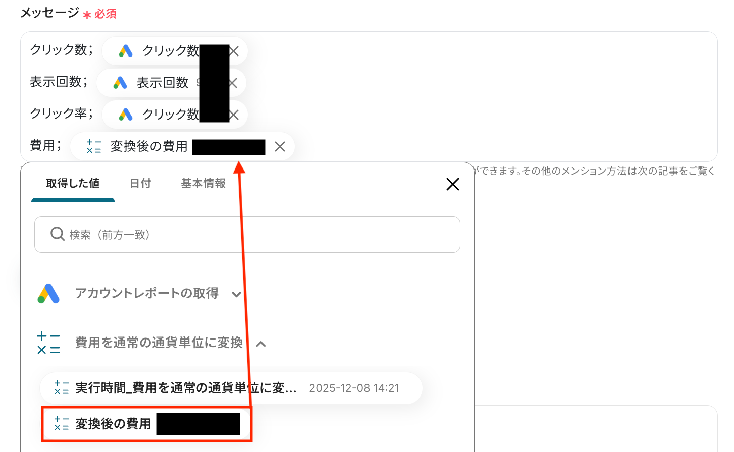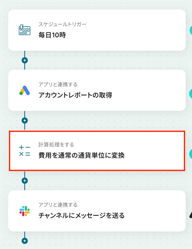 計算式 入力欄をクリックすると、前のステップでGoogle Adsから取得した値が表示されるので、選択して入力しましょう。 取得した値を活用することで値が固定化されず、フローボットを起動するたびに最新の情報を自動で反映できます。