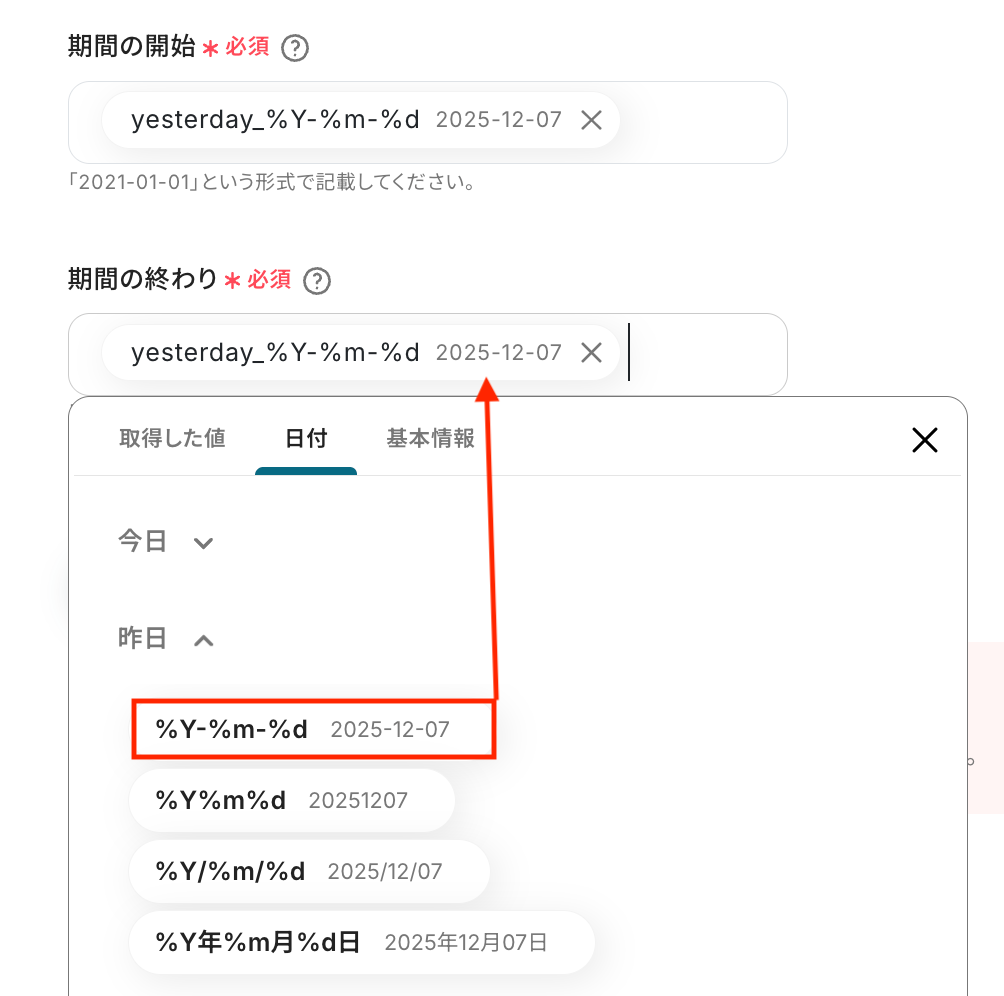 Google Adsのオペレーションでは、レポートを取得したい対象の「広告アカウントID」を任意で設定してください 同じくGoogle Adsのオペレーションにて、レポートの集計対象となる「期間の開始」と「期間の終わり」を任意で設定することが可能です