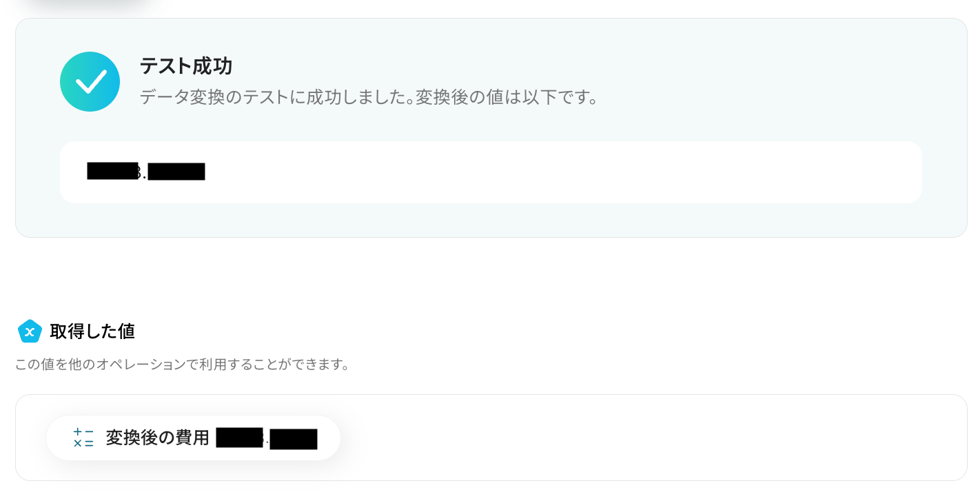 テストに成功すると、変換後の費用が正しい通貨単位で表示されます。 以下の取得した値を活用して、この後のステップでSlackからメッセージの送信が可能です。 内容を確認し、「完了」をクリックしましょう。