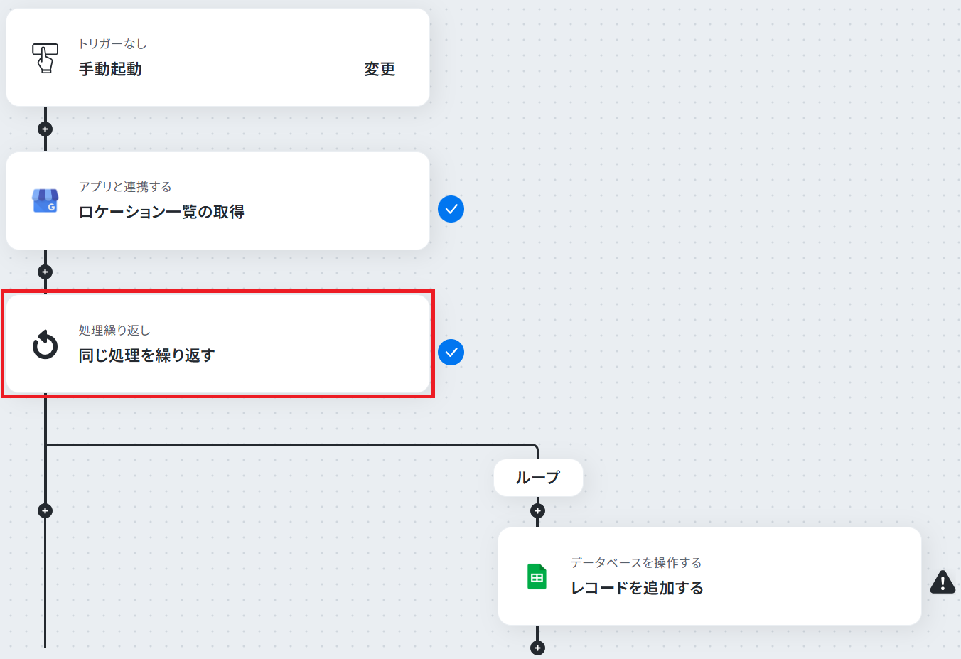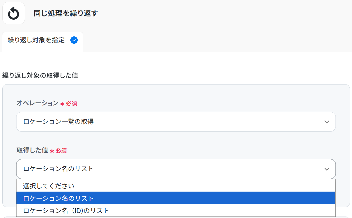 ステップ4:処理繰り返し設定 先ほど取得したロケーション情報のリストを順番に処理するため、繰り返し設定を行います。 「同じ処理を繰り返す」をクリックしましょう。