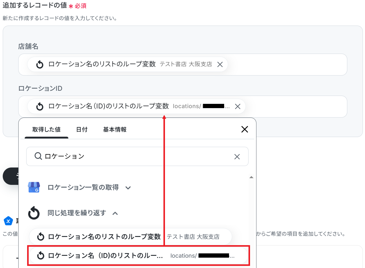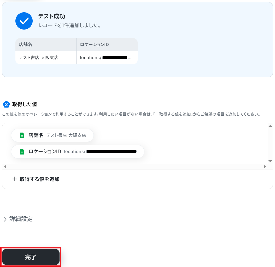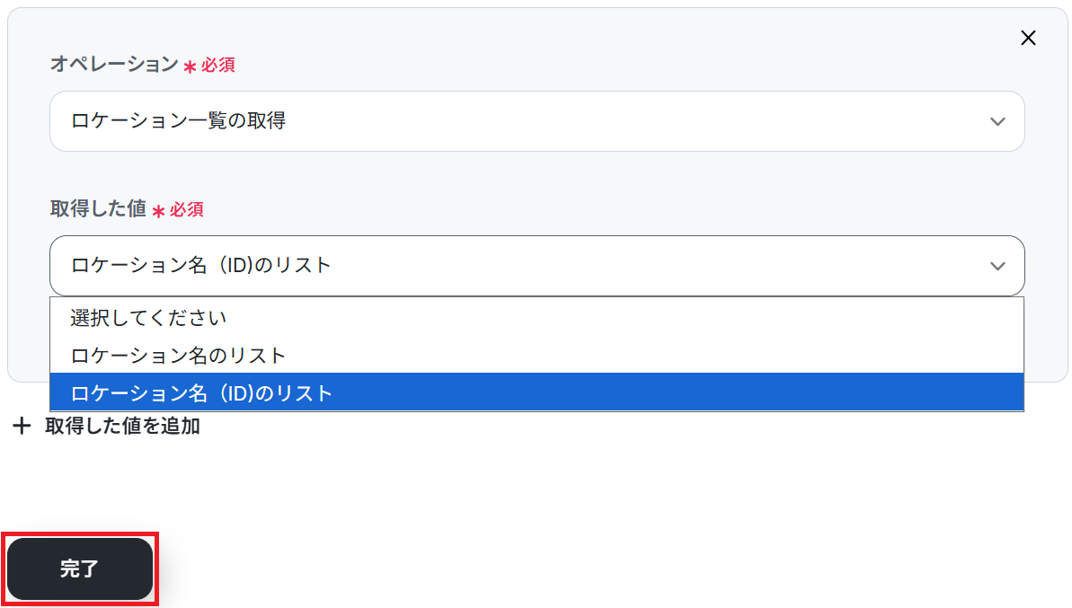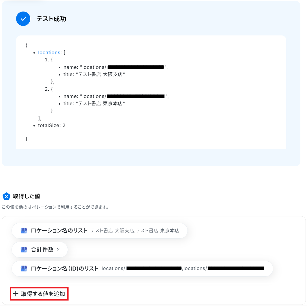 なお、取得した値に取得したいレコードが反映されていないことがあります。 その場合「+ 取得する値を追加」から項目を追加可能です。