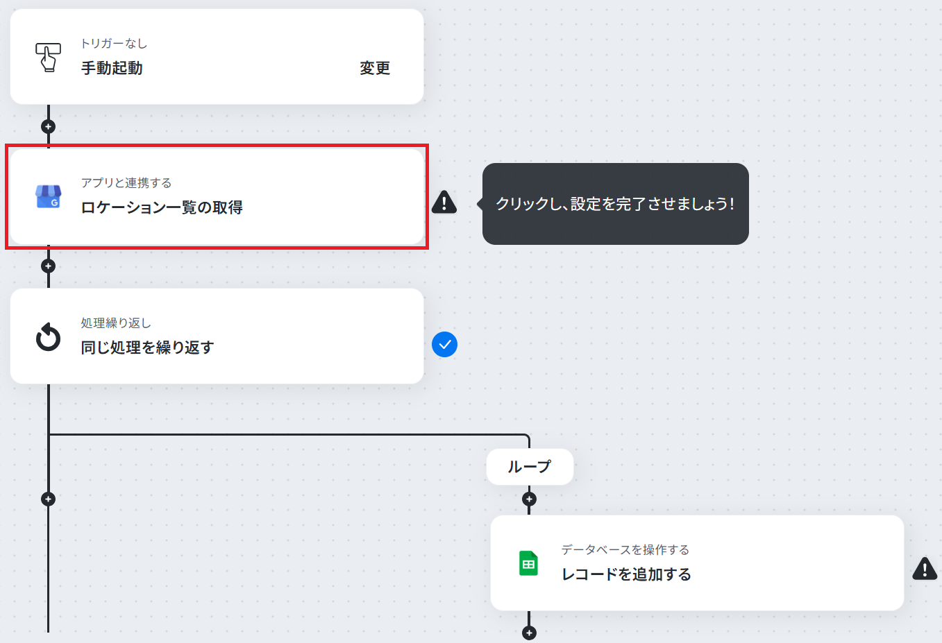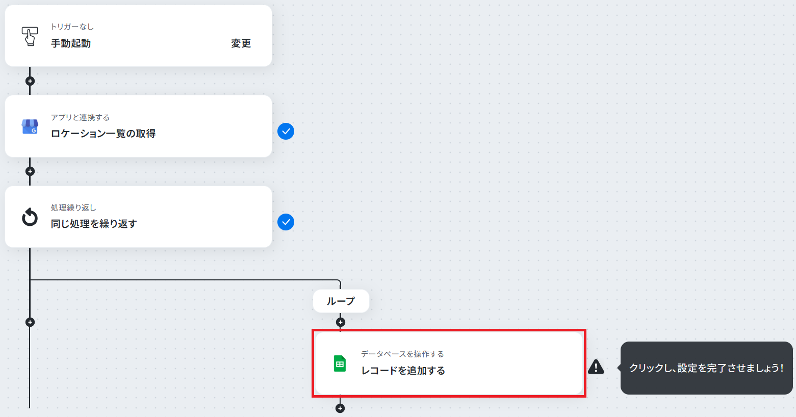 Googleビジネスプロフィールの設定では、情報を取得したいアカウントIDや、取得する情報項目(返却フィールド)を任意で設定してください。 ループ機能では、前段のオペレーションで取得したロケーション情報の一覧を繰り返し処理の対象として設定してください。 Microsoft Excelの設定では、取得したロケーション情報を記録したい任意のファイルやシート(データベース)を指定してください。 ■注意事項