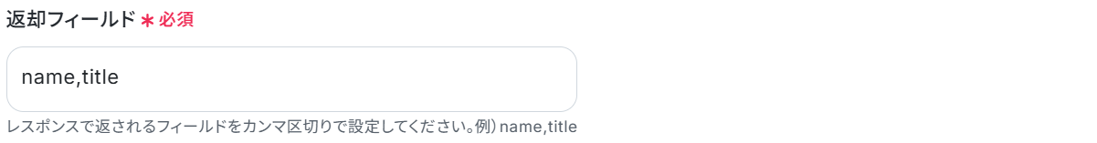 次にサポートされているすべてのフィルタ フィールドのリスト を参考に、取得したい項目の返却フィールド をカンマ区切りで入力しましょう。 今回はロケーション名 とロケーション名(ID) を取得するため、「name」と「title」の2つを入力しています。