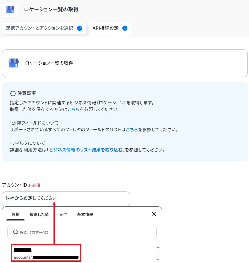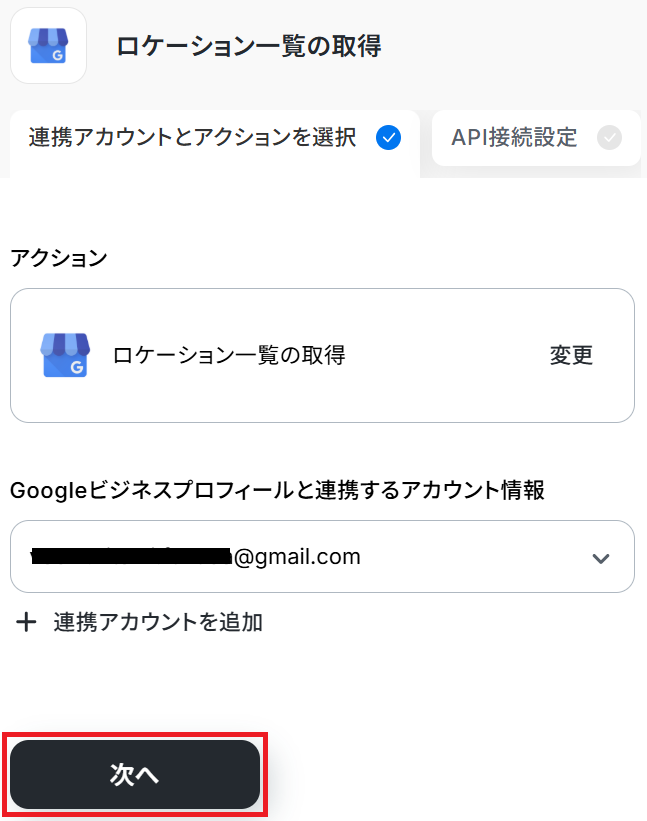 タイトル と連携するアカウント情報 を任意で設定し、アクションはテンプレート通りに「ロケーション一覧の取得」のまま「次へ」をクリックします。