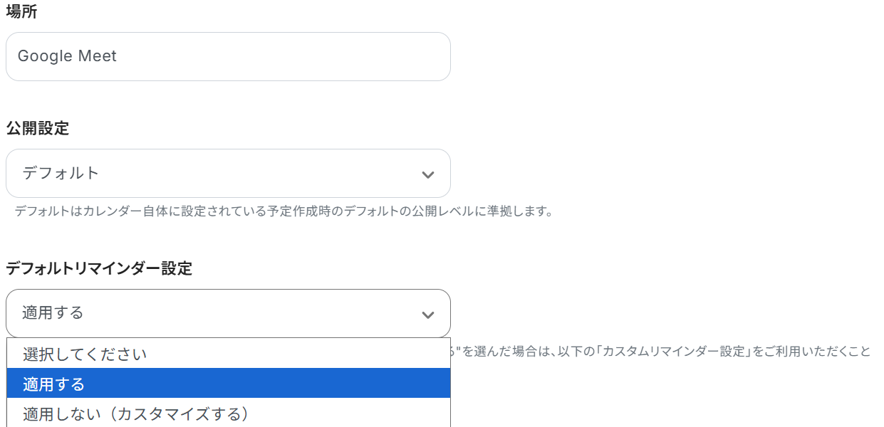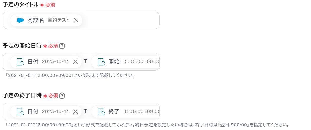 ・予定のタイトル:予定のタイトルを入力します。①のフォームで取得した値を埋め込むことも可能です。