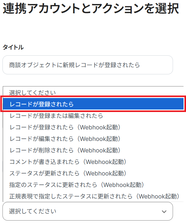 例えばkintoneでのレコード登録をトリガーとしたい場合、連携アカウントとアクションを選択する画面でSalesforceのトリガーアクションをkintoneの「レコードが登録されたら」などに変更した上で設定してください。