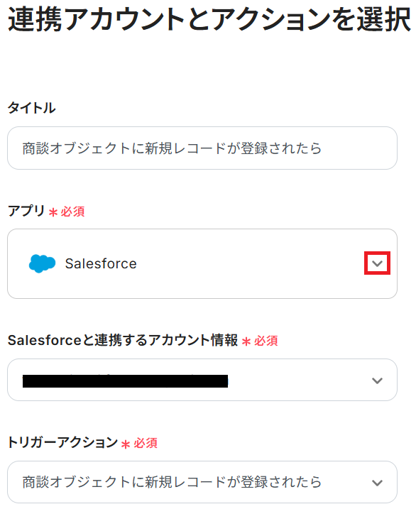 タイトルと連携するアカウント情報を任意で設定し、トリガーアクションはテンプレート通りに「商談オブジェクトに新規レコードが登録されたら」のまま「次へ」をクリックしてください。