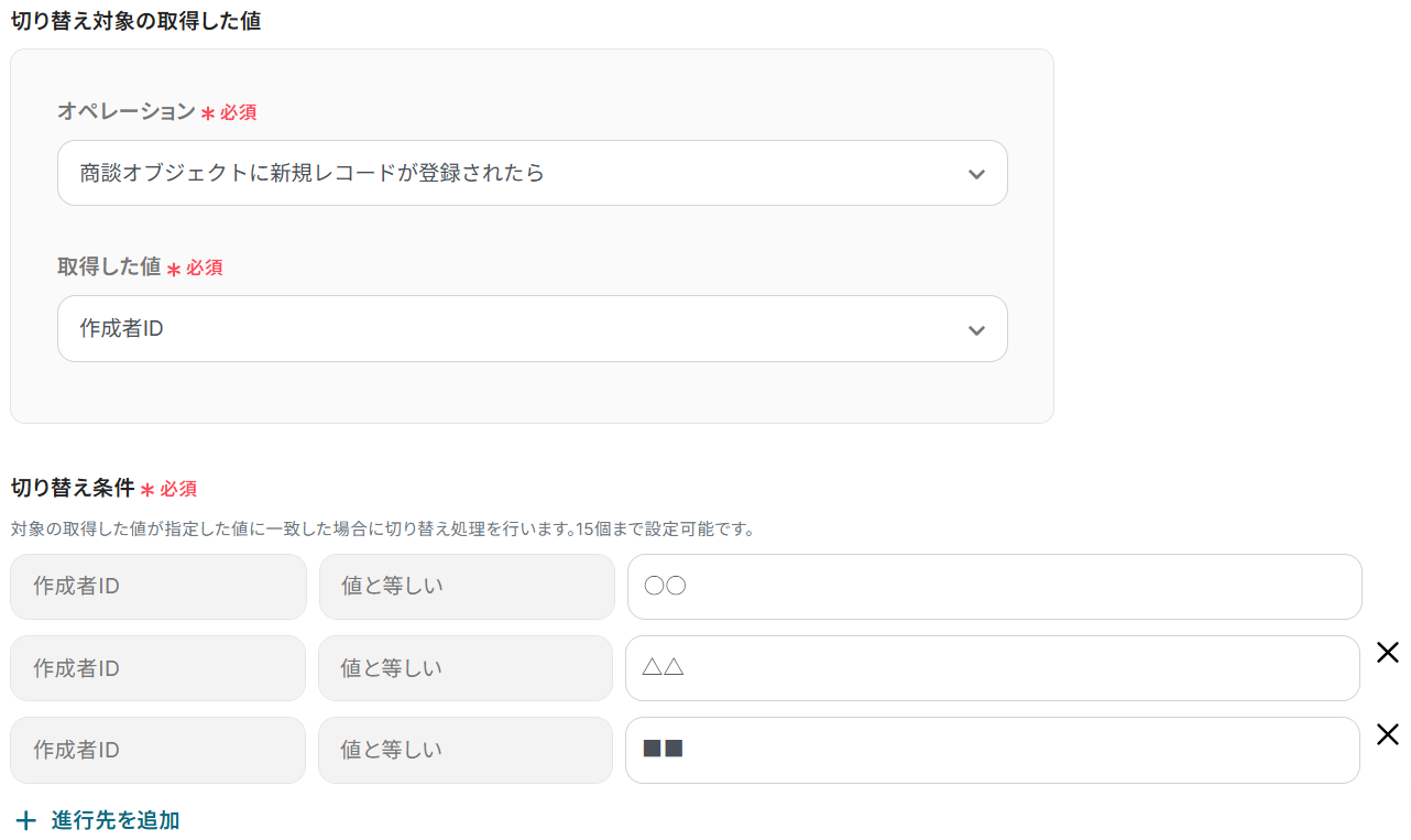 例えば「作成者IDが特定のIDと等しい場合」などと設定することで進行先の切り替えができます。