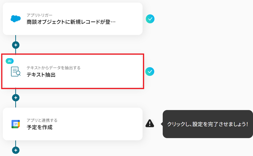- Salesforceのトリガー設定、データを抽出する設定、Googleカレンダーのアクション設定
