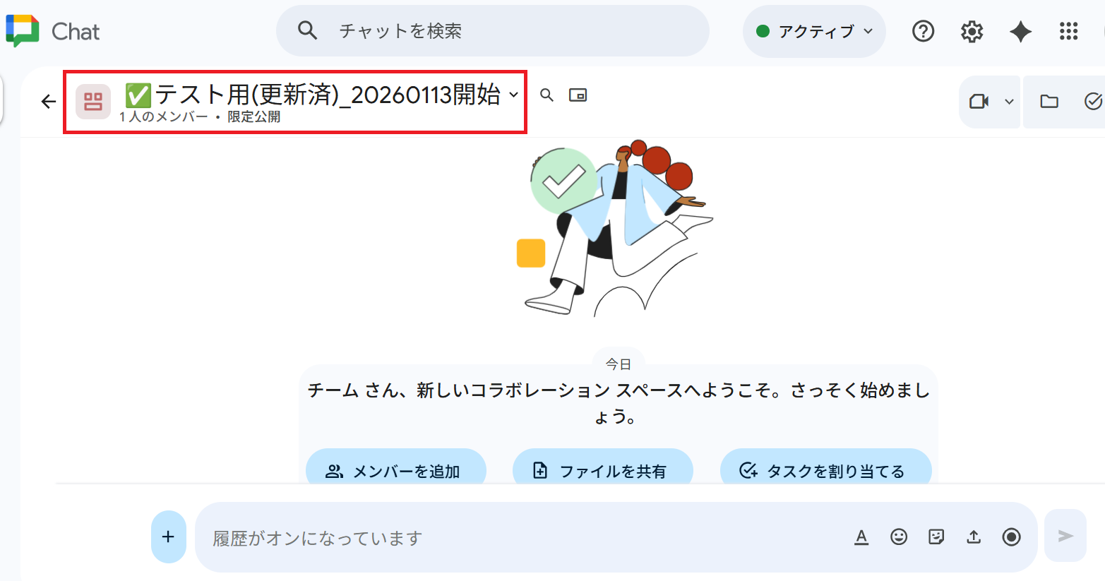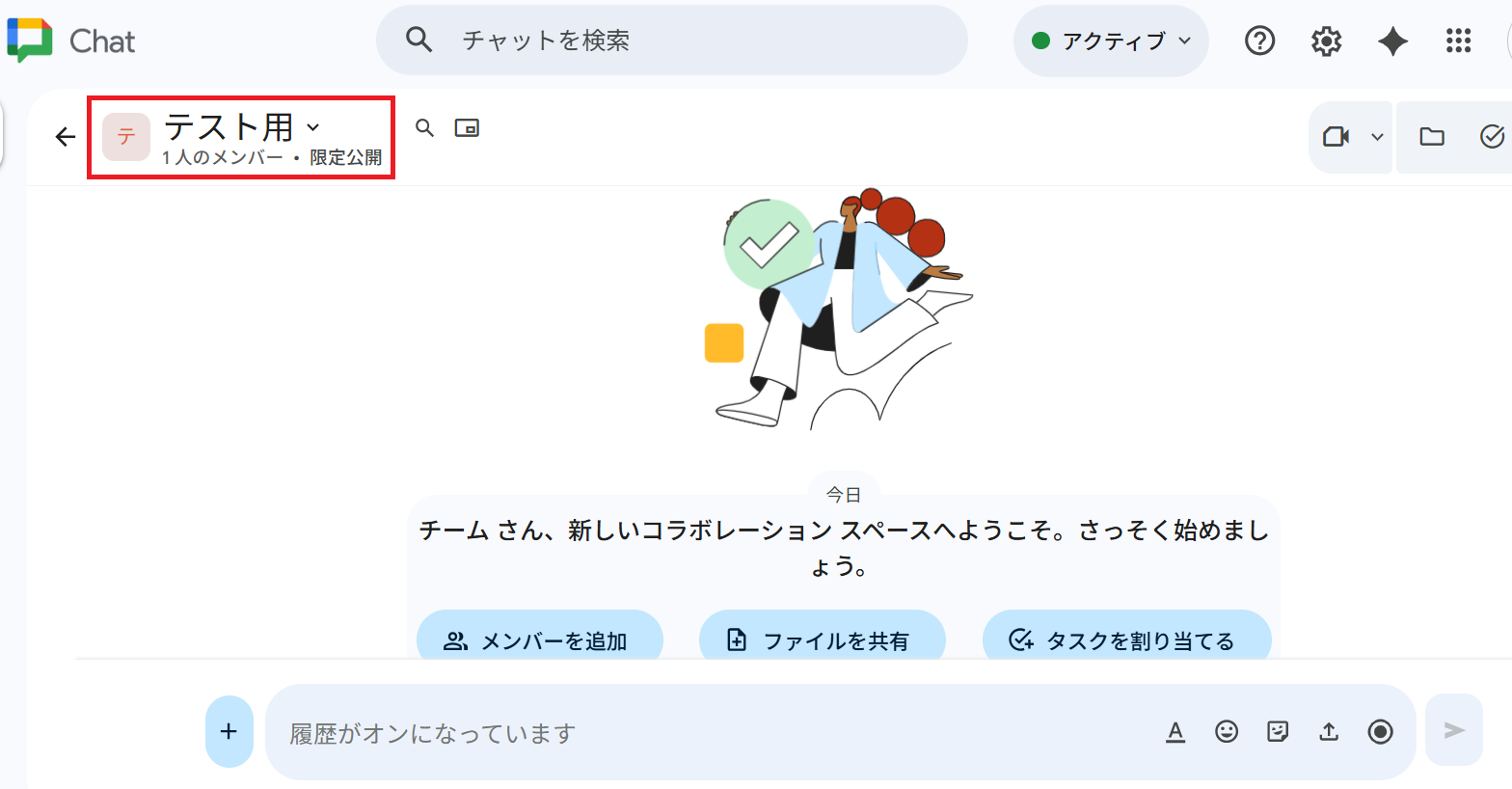 準備として、Google Chatでテスト用のスペースを作成しておきましょう。