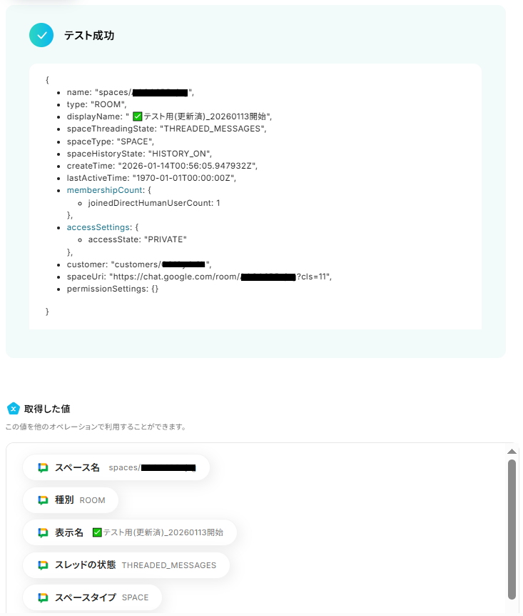 確認できたら設定画面に戻り、回答のサンプル値を入力して保存しましょう。 ここで取得した値を次のステップで活用できるため、最初に用意したスペースのID と、更新に使うスペース名 を入力しています。 ※取得した値 とは? トリガーやオペレーション設定時に「テスト」を実行して取得した値のことです。 後続のオペレーション設定時の値として利用でき、フローボットを起動する度に変動した値となります。