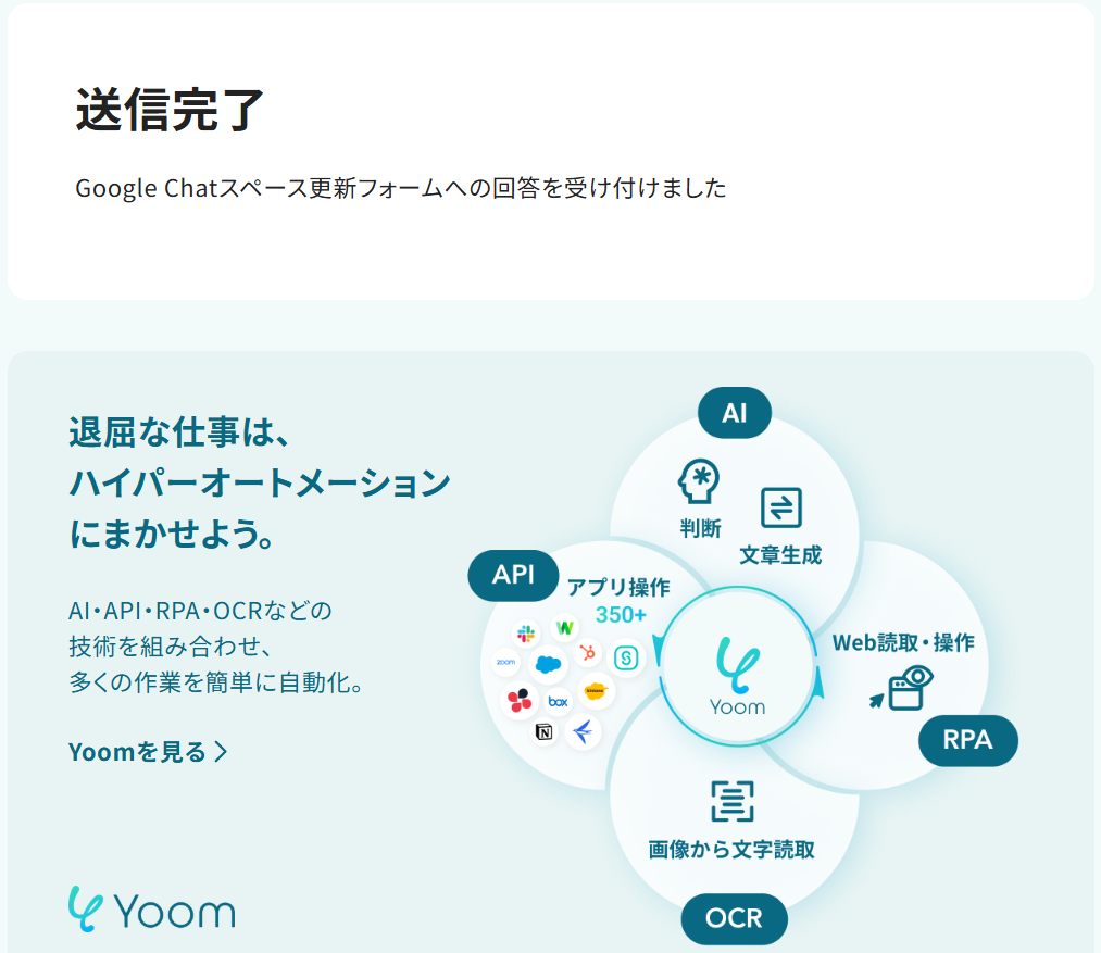 フォームから回答が送信されたら、Google Chatのスペースを更新する フローを解説していきます! ここではYoomを使用してノーコードで設定していくので、もしまだYoomのアカウントをお持ちでない場合はこちらの登録フォーム からアカウントを発行しておきましょう。