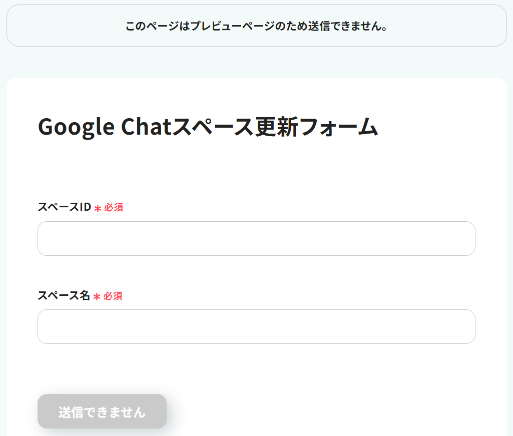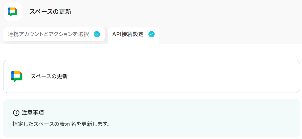 Google Chatの「スペースを更新する」オペレーションでは、更新したいスペースを任意で指定してください。 対象スペースのIDや表示名は、固定のテキストを設定するだけでなく、トリガーとなったフォームの回答内容を変数として埋め込むことも可能です。これにより、動的な情報更新を実現できます。 ■注意事項