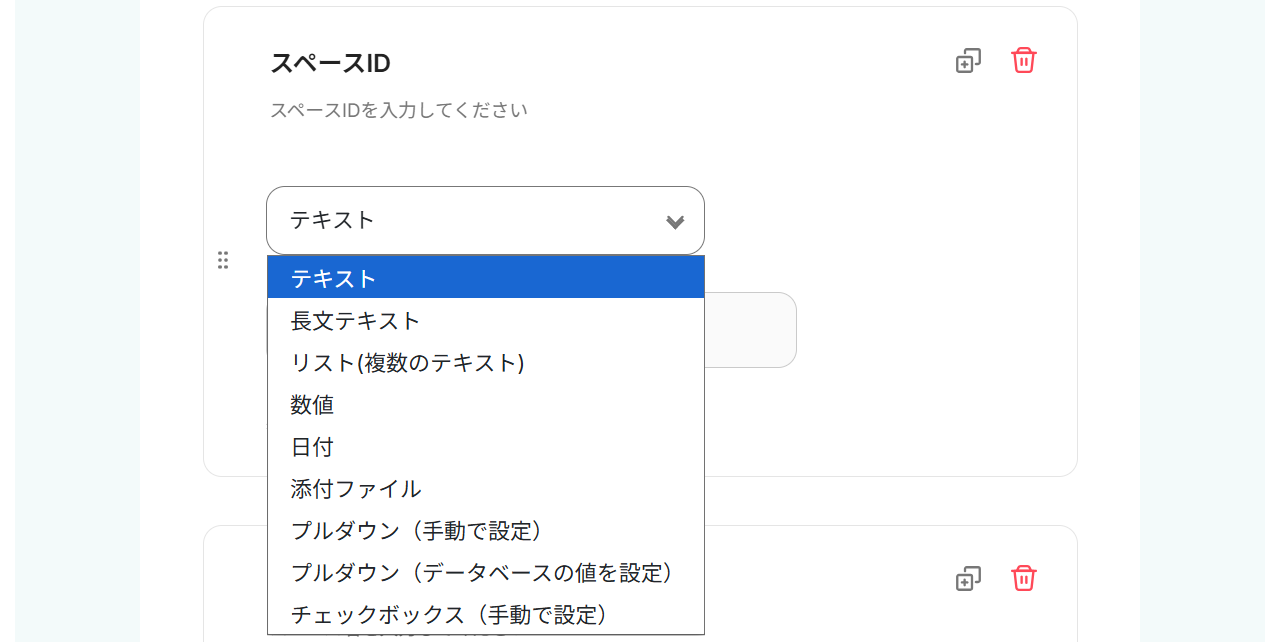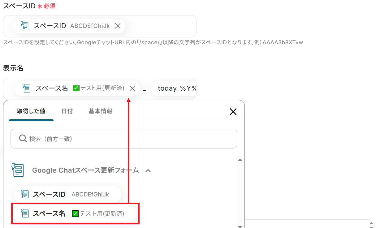 スペースID ・表示名 の欄には、それぞれフォームから取得した値が予め設定されています。 そのままでも問題ありませんが、固定のテキストや記号、日付の変数などを組み合わせて複雑な命名規則を設定することも可能です。 ※以下のように取得した値を設定することで、トリガーが実行されるたびに最新の回答内容を反映できます。 設定が完了したらテストしてください。