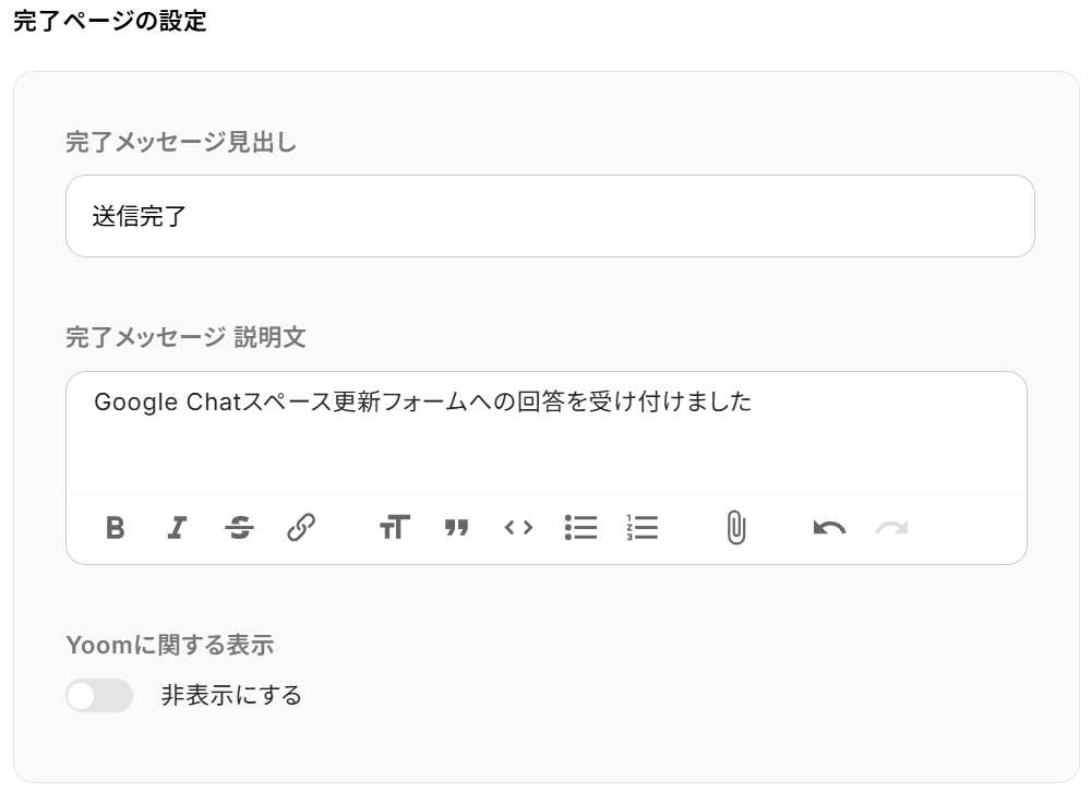 作成したらYoomの設定画面に戻り「Google Chatスペース更新フォーム」をクリックし、スペース名を更新するためのフォームを作成していきます。