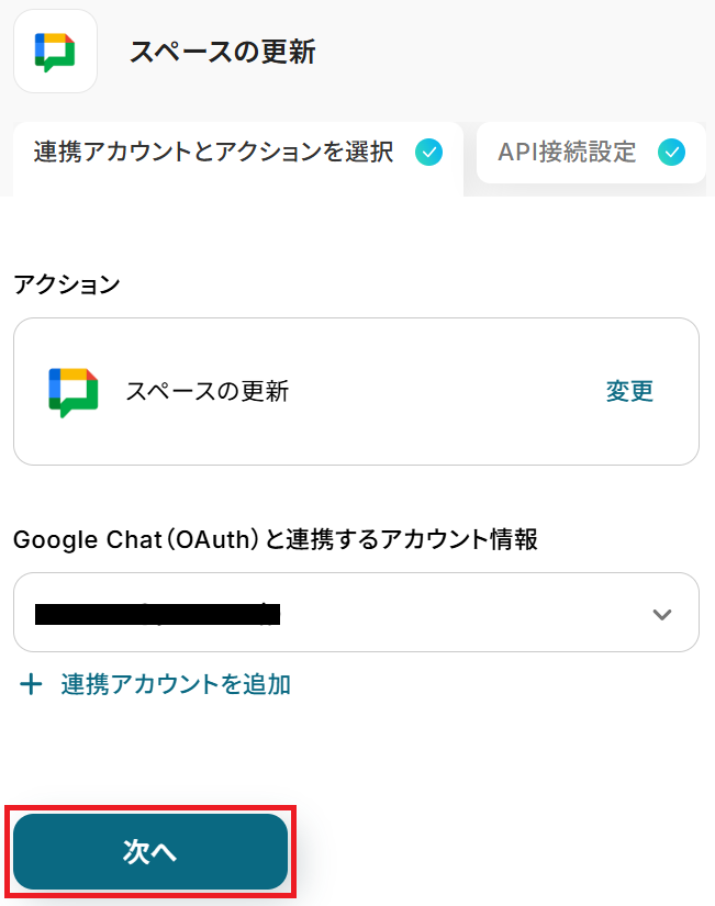 タイトルと連携するアカウント情報を任意で設定し、アクションはテンプレート通りに「スペースの更新」のまま「次へ」をクリック。
