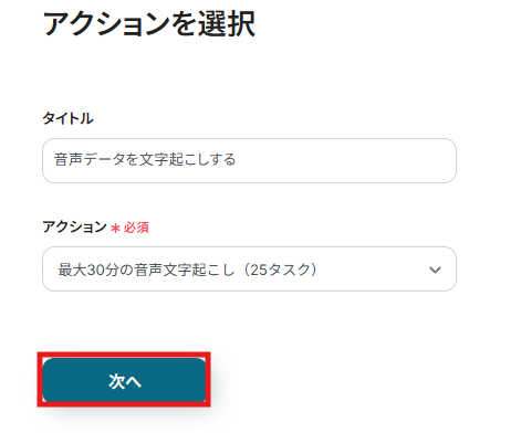 2) アクションは「最大30分の音声文字起こし(25タスク)」が選択されていることを確認して、「次へ」をクリックします。 必要に応じてアクションは変更してくださいね。 ただし、トリガーの起動間隔と同様にプランによってタスクの数に上限がありますので、ご注意ください。