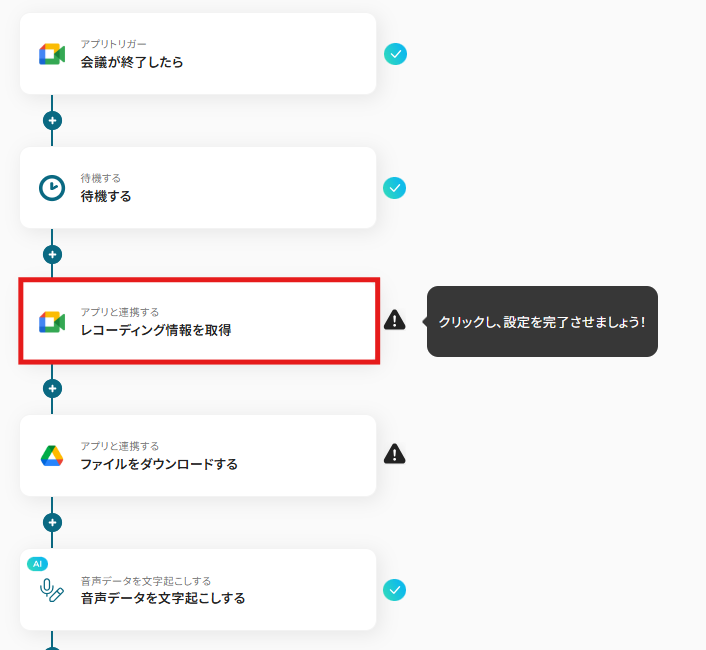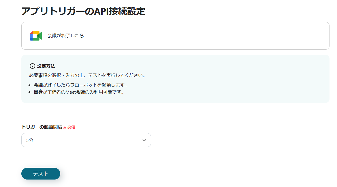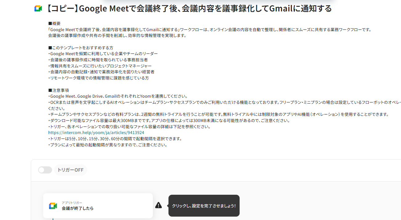 Google Meetのトリガー設定では、会議の終了を検知する起動間隔を任意で設定してください。 Google Meetのオペレーション設定では、録画情報を取得したい会議のIDを、トリガーから取得した動的な値を用いて設定してください。 Slackのオペレーション設定では、通知を投稿するチャンネルを任意で指定してください。また、通知メッセージは自由にカスタマイズできるため、取得した会議名や録画URLなどの情報を含めて作成してください。 ■注意事項