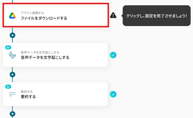 1) フローに戻り、「音声データを文字起こしする」のアイコンをクリックします。 ※OCRや音声を文字起こしするAIオペレーションは、チームプラン・サクセスプラン限定の機能です。フリープランやミニプランでセットするとエラーになってしまうので、ご注意ください。 ※チームプランやサクセスプランなどの有料プランは、2週間の無料トライアルが可能です。トライアル期間中は、通常だと制限があるアプリやAIオペレーションもすべて使えるので、気になる機能をぜひお試しください。