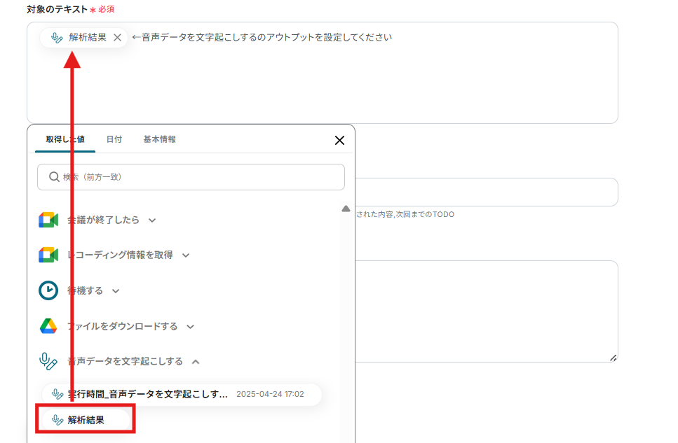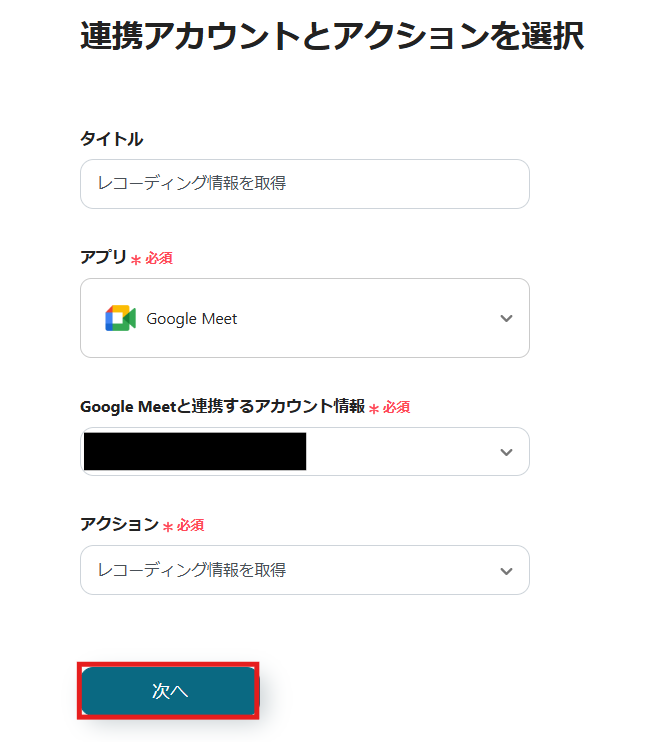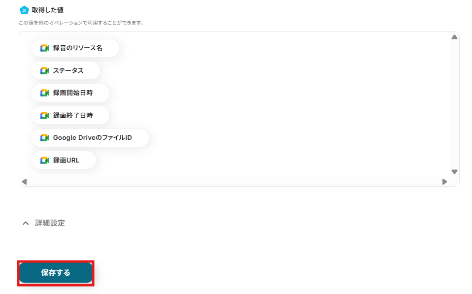 ステップ5:Google Meetのレコーディング情報を取得するアクションを設定