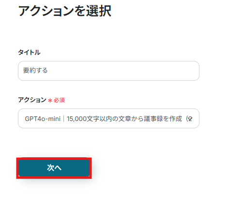 2) アクションは「15,000文字以内の文章から議事録を作成」を選択して、項目を入力します。 件名や本文には帳票作成フォームで取得したアウトプットを活用できます。