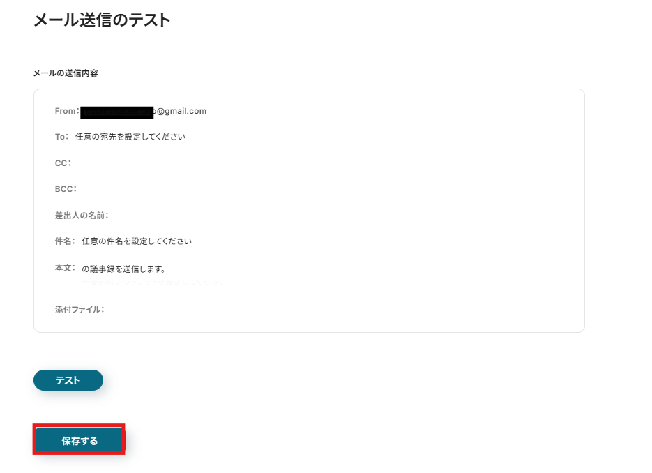 メール内容を確認して「テスト」をクリックし、テストが完了したら、「保存」します。