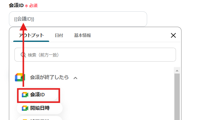 3) 会議IDはGoogle Meetのアウトプット情報を活用して入力してください。 入力が完了したら「保存」します。アウトプットについて | Yoomヘルプセンター
