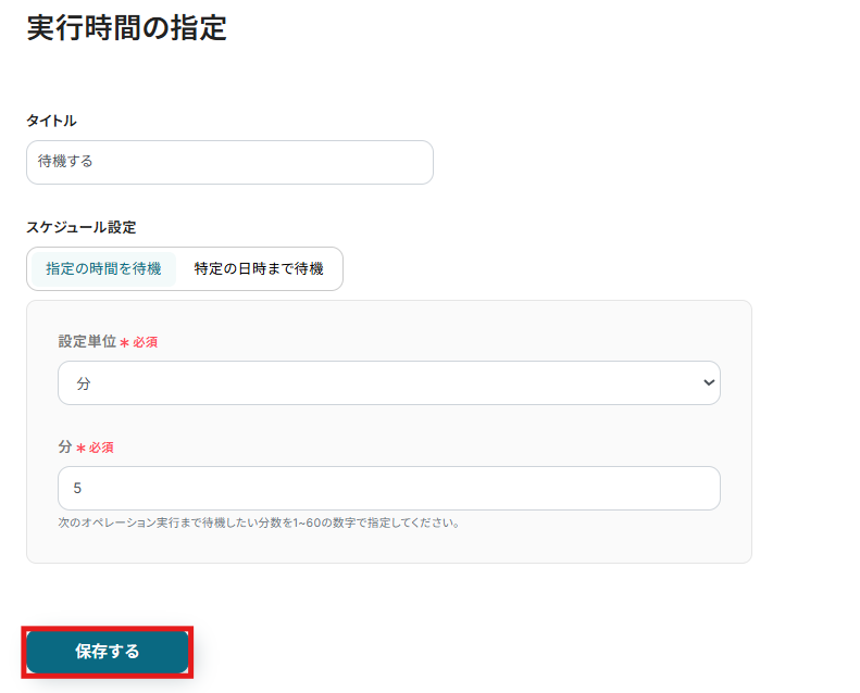 2) 録画データを解析したいので、5分間待機するアクションが設定されています。 希望の時間がなければそのまま、「保存」をクリックしてください。