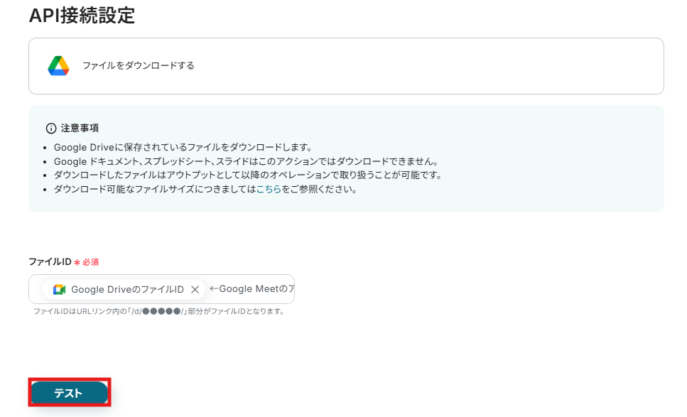 3) ファイルIDは先ほど同様にアウトプットから選択して入力します。 完了したら「テスト」をクリックし、テスト成功後「保存」をクリックします。