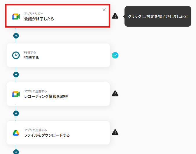 右に「!」が表示されているアイコンを上から順番にクリックし、オペレーションを設定します。1) まずは「アプリトリガー 会議が終了したら」をクリックしてみましょう!