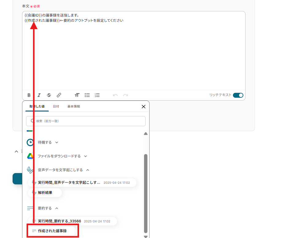 待機機能では、Google Meetのレコーディング処理時間を考慮し、任意の待機時間を設定してください。 AI機能による要約では、要約対象に前段のオペレーションで取得した情報を変数として設定でき、要約するための指示も自由に設定可能です。 Outlookのメール設定では、宛先や件名、本文に前段で取得した情報を変数として利用でき、固定のテキストと組み合わせてメッセージを作成できます。 ■注意事項