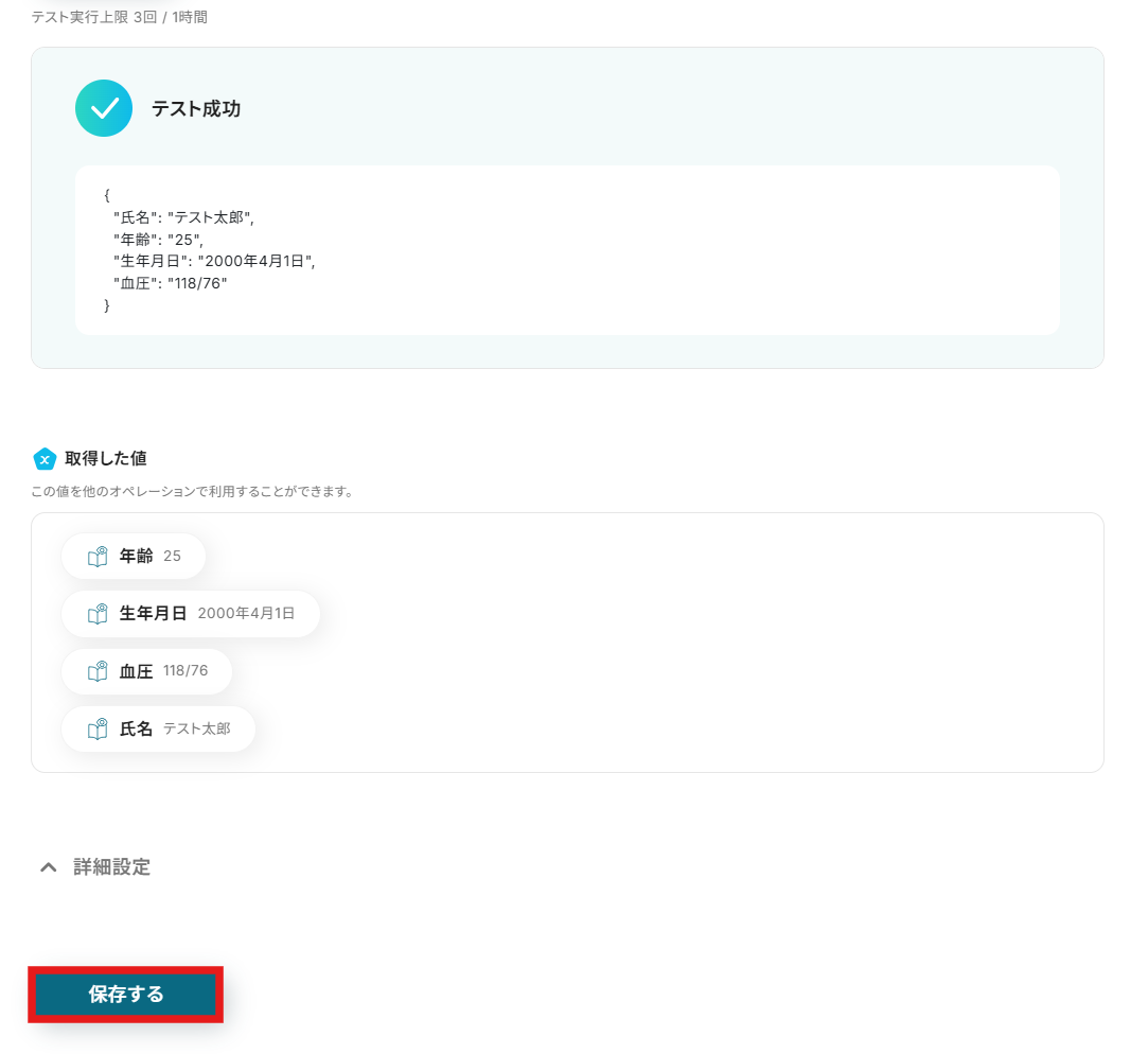 設定が終わったら、「テスト」をクリックします。 テストが成功すると、ステップ4でダウンロードした健康診断書から、先ほど指定した抽出項目がアウトプットとして取得できます。正しく情報が取得できていることを確認してください。