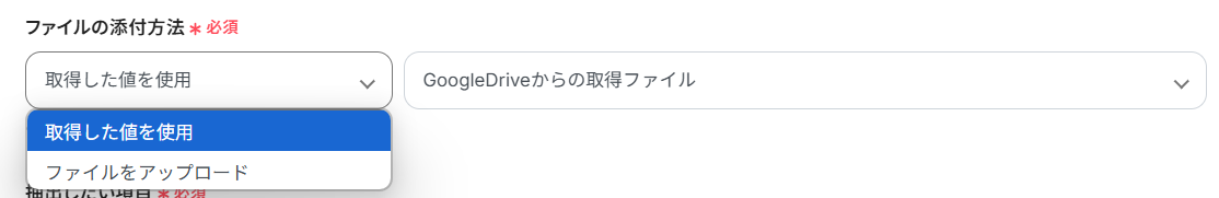 ファイルの添付方法: プルダウンで「ファイルをアップロード」か「取得した値を使用」を選択できます。今回は「取得した値を使用」を選択しています。 こうすることで、ステップ4でダウンロードしたファイルを、自動でOCR処理できるようになります。