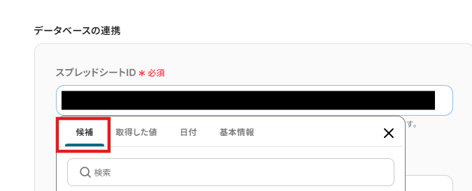 スプレッドシートID、スプレッドシートのタブ名: 入力欄をクリックすると、連携しているアカウントから候補が表示されるので、その中から選択してください。 ここで指定したシートのタブに、ステップ5で抽出した健康診断のデータが記録されるようになりますよ!
