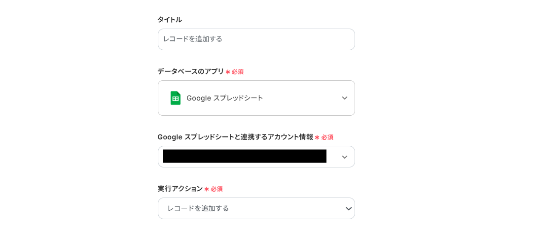 連携するアカウント情報には、ステップ1で連携したアカウントの情報が反映されています。アクションは「レコードを追加する」のままにしましょう。