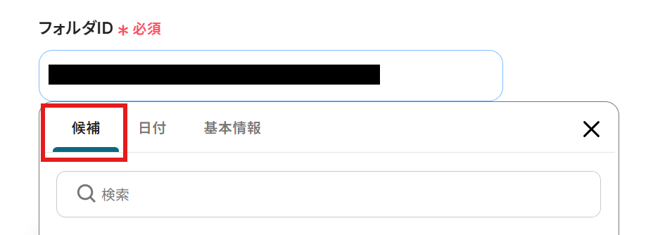 フォルダID :入力欄をクリックすると候補が表示されるので、その中から選択しましょう。ここで設定したフォルダにファイルがアップロード(またはフォルダ作成)されると、フローボットが自動的に起動するようになりますよ!