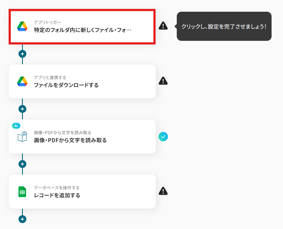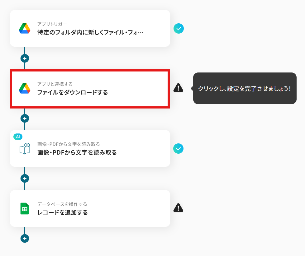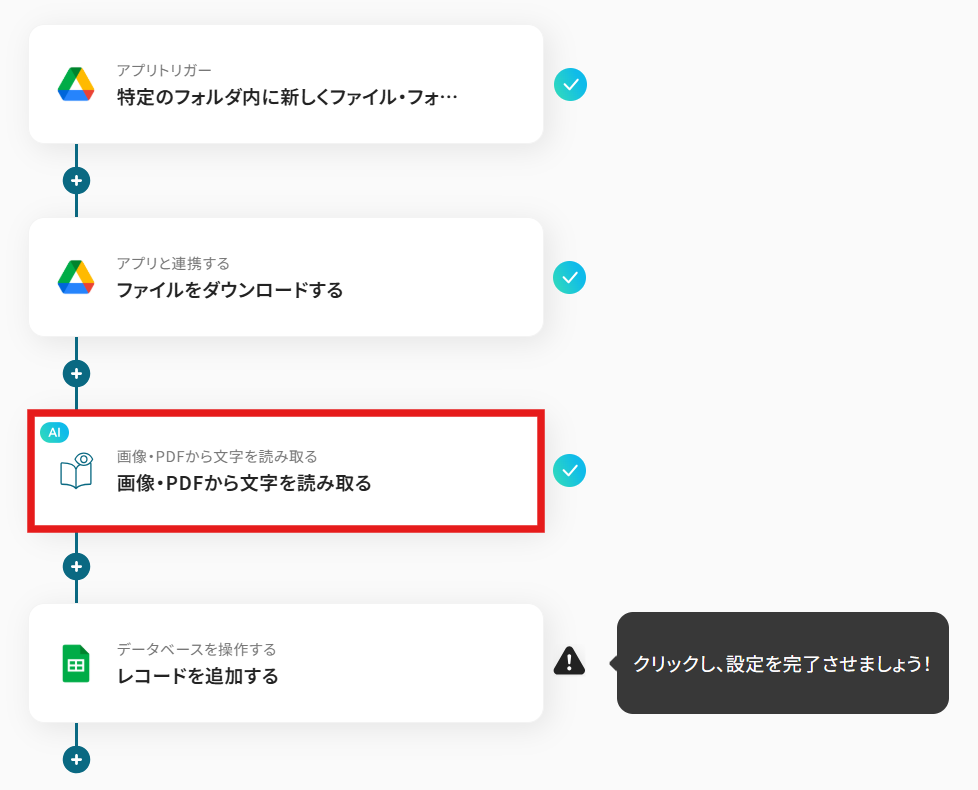 AI機能の「画像・PDFから文字を読み取る」では、読み取り対象のファイルや、抽出したい情報の項目(氏名、特定数値など)、言語などを任意で設定してください。 Google スプレッドシートの「レコードを追加する」では、データを追加したいスプレッドシートやワークシートを指定し、どの列にどの情報を追加するかをカスタマイズしてください。 ■注意事項