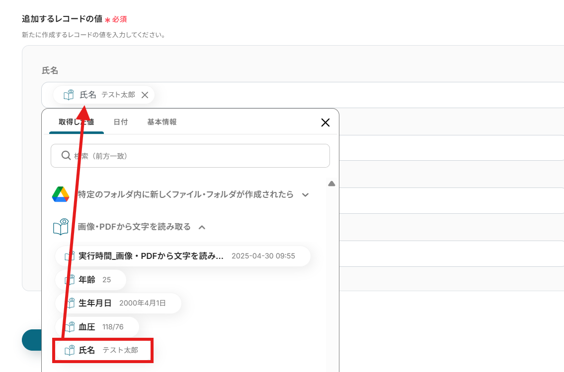 各項目は入力欄をクリックすると、OCRで読み取った値を引用できます。 ここでは、ステップ5で抽出したアウトプットを用いて設定しましょう!