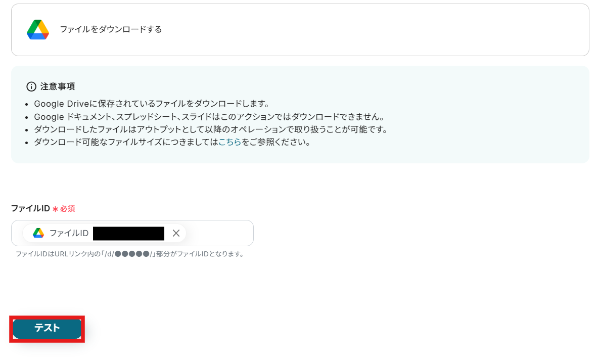次に、ファイルIDを設定します。 ファイルIDは元から設定されているので、そのまま「テスト」をクリックしましょう。 ここでは、ステップ3で取得したファイルデータをダウンロードするように設定されています。