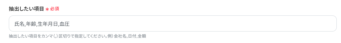 抽出したい項目: デフォルトで、「氏名」「年齢」「生年月日」「血圧」を抽出するように設定されています。 追加で抽出したい項目がある場合は、カンマ(,)で区切って入力しましょう。