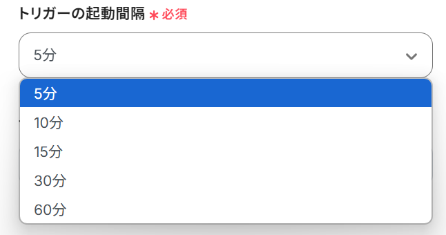 トリガーの起動間隔 :5分、10分、15分、30分、60分から起動間隔を選択できます。 プラン によって設定できる最短の起動間隔が異なるので、事前に確認してくださいね!