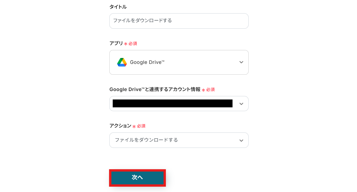 ステップ3同様に、連携するアカウント情報にはステップ1で連携した情報が反映されています。 アクションは「ファイルをダウンロードする」のままにし、「次へ」を押して設定を進めましょう!