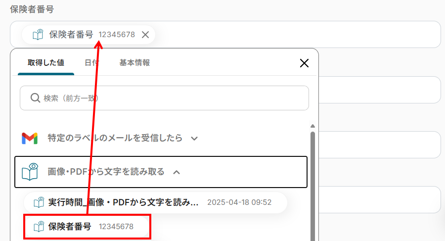 ここでは、先ほど抽出した保険証のデータをGoogle スプレッドシートのレコードに追加する設定を行います。