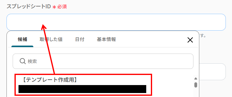 - スプレッドシートのタブ名:先ほど入力したスプレッドシートIDと同様に、入力欄をクリックし対象のシート名を候補より選択してください。