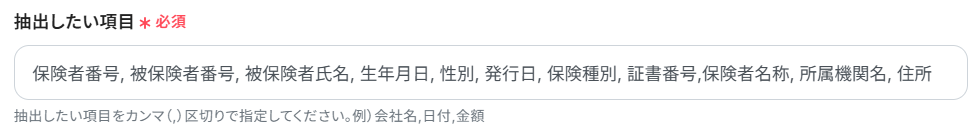 今回は、保険証から「保険者番号, 被保険者番号, 被保険者氏名, 生年月日, 性別, 発行日, 保険種別, 証書番号,保険者名称, 所属機関名, 住所」を抽出するために下記のように入力しました。お好みに合わせて、カンマ(,)区切りで入力しましょう。